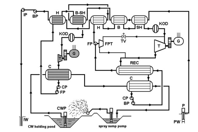 起初的電站使用的就是普通的雙循環地熱發電流程的機組。在優化了1979年開始使用的發電機組以后,修整后的地熱電站是一個完全不同的發電機組。以前的主渦輪機、真回流熱電轉換器、和交互蘭金循環都被還掉了。取而代之的是,一個簡單的,非提取異丁烷渦輪,和九個更大的鹵水熱電交換機。在熱電交換機的管道所在的一邊是鹵水,在殼側是碳水化合物。驅動沸騰給水渦輪的異丁烷來自于一個單獨的過熱器的側流。發電系統上安裝了一個降壓閥,來降低異丁烷的壓力以適應BFPT的注入壓力。換熱器沒有更換,但是現在只是作為一個異丁烷循環的預熱器。丙烷循環現在也已經獨立于異丁烷循環。